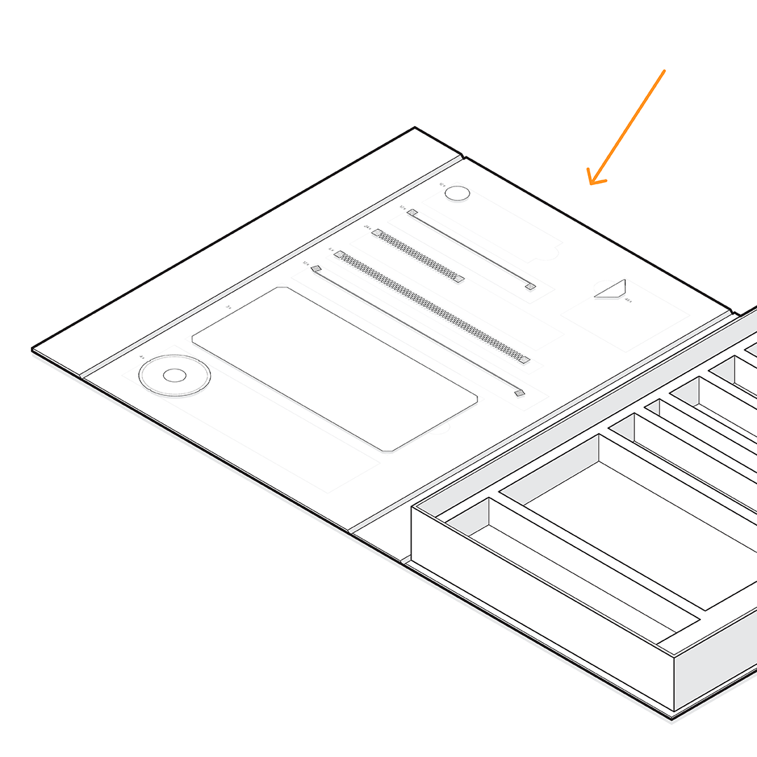 A pasta não só guarda a Chapa de Base e o Livro/Manual como também mantém os componentes em seus devidos lugares. Se a pasta não for colocada na caixa, os componentes podem se mexer ou até cair de suas inserções durante o transporte ou armazenamento.