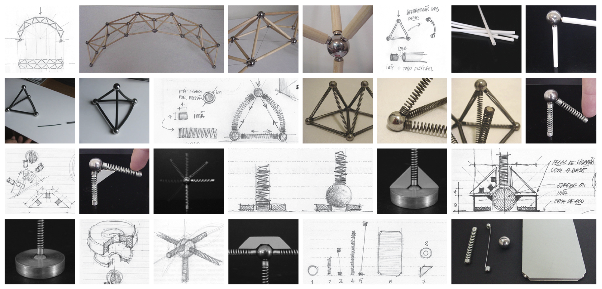 Primeiros protótipos e desenhos originais do Sistema Estrutural Mola, desenvolvidos entre os anos de 2004 e 2006.