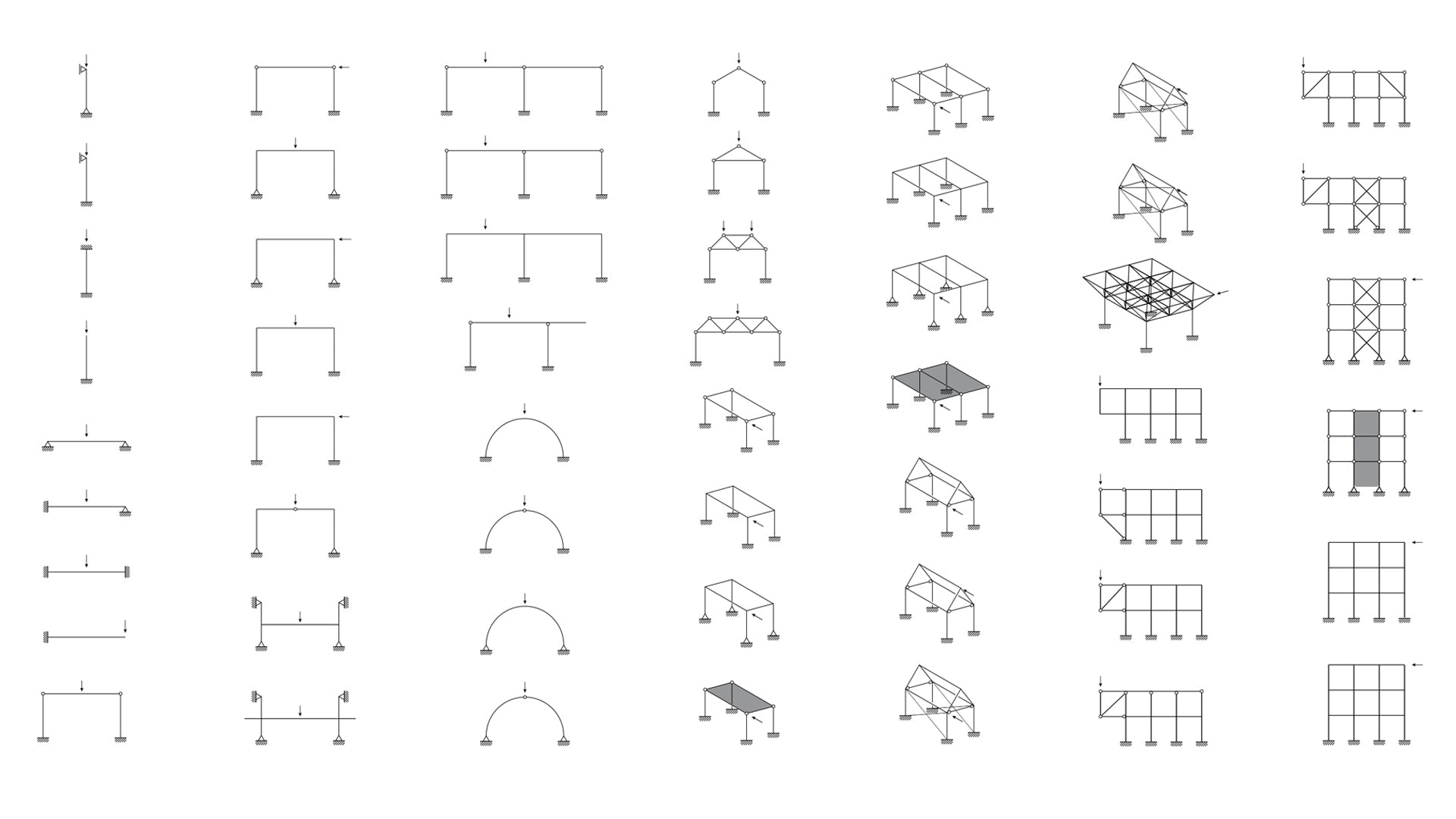Além de validar o comportamento do Mola, a pesquisa também apresenta uma série de sistemas estruturais montados com o sistema, reproduzindo estruturas reais.
