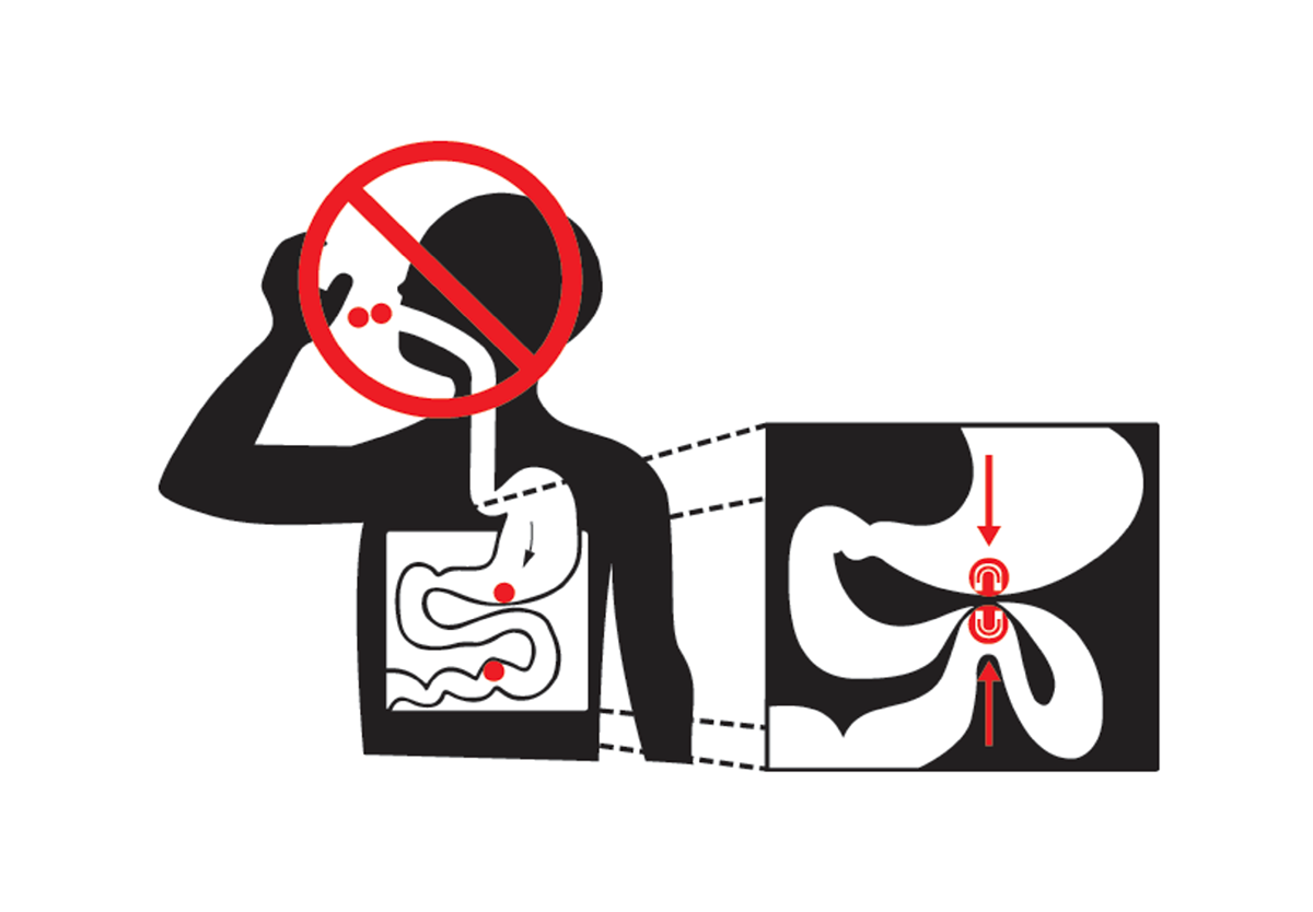 Sintomas de ingestão de ímãs não são específicos (dor abdominal, febre, etc.), e podem levar de horas a semanas para aparecer. Não tratar adequadamente caso ocorra a ingestão de ímãs pode causar obstrução intestinal, perfuração, sangramento, infecção e morte.