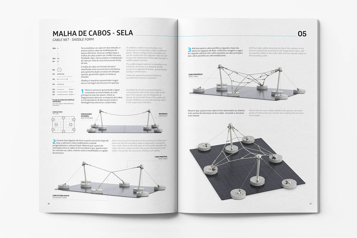 Os Manuais do Mola são guias práticos bilíngues (Português/Inglês) que contêm explicações sobre as peças e processos de montagem, bem como uma série de exemplos de sistemas estruturais, apresentados de maneira clara e didática.